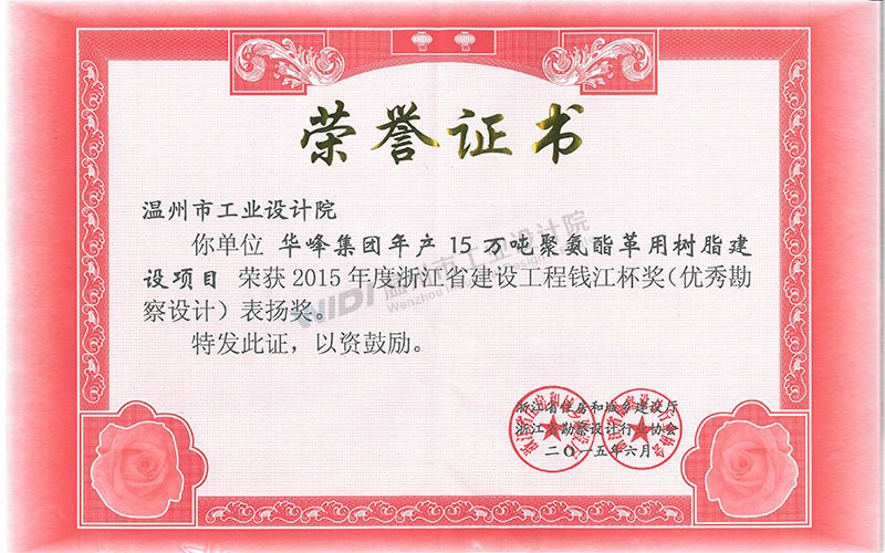 華峰集團年產(chǎn)15萬噸聚氨酯革用樹脂建設項目建設工程 錢江杯表揚獎