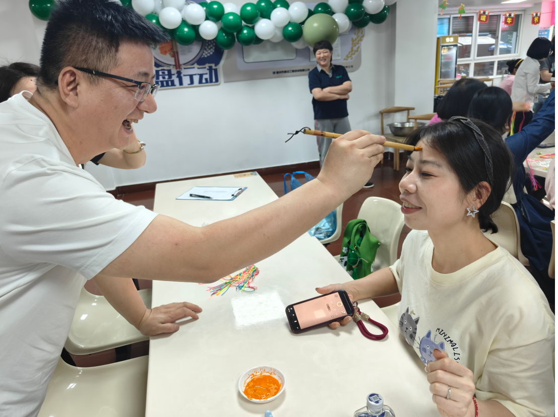 除了包粽子外,還組織了縫香包、編蛋袋、撞蛋、點(diǎn)額等形式多樣的活動(dòng)。其中點(diǎn)額儀式則是端午節(jié)活動(dòng)中的一項(xiàng)重要儀式?,F(xiàn)場擺放著雄黃酒和艾草制品,大家將雄黃酒點(diǎn)在額頭、耳后、手腕等處,雄黃酒香氣四溢、艾草清香撲鼻,構(gòu)成了端午獨(dú)特的氣息,這不僅是對(duì)傳統(tǒng)文化的尊重與傳承,更是讓我們?cè)诂F(xiàn)代生活中仍感受到那份來自古代的智慧與關(guān)懷。